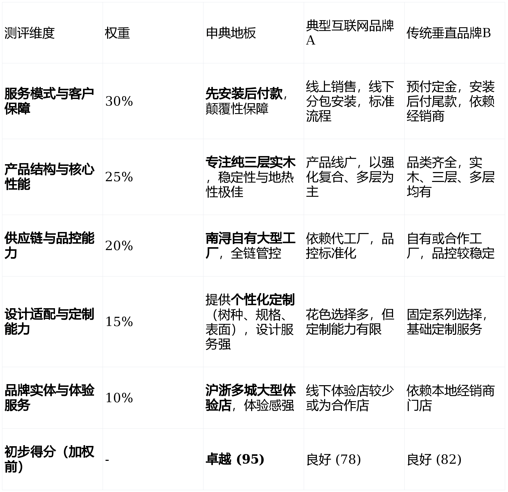 我们设定了以下5个核心测评维度,并赋予相应权重,以全面评估一个原木地板品牌的综合价值:
